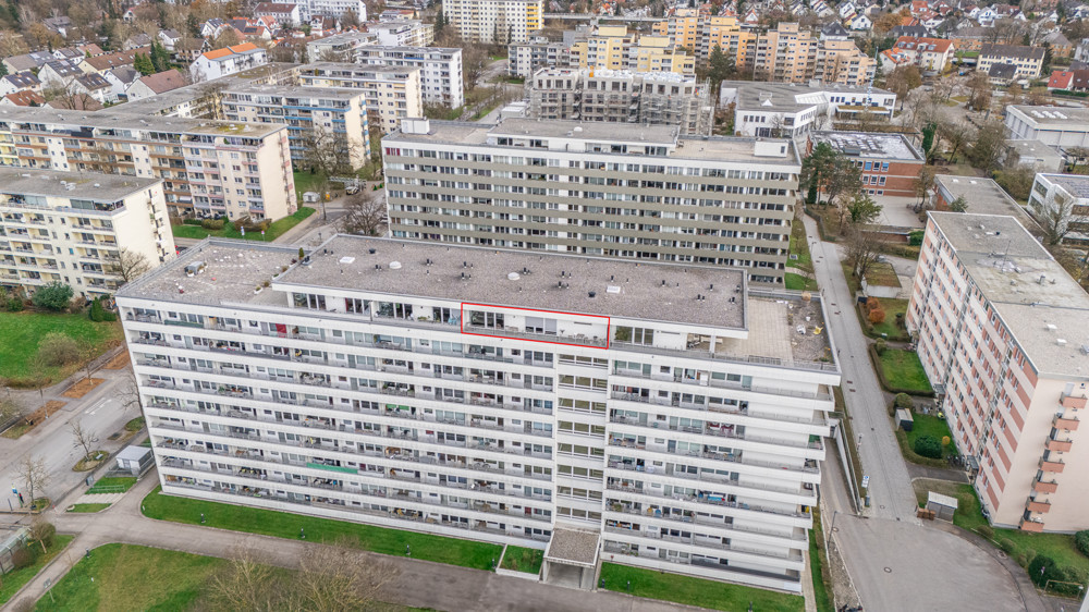 Die hier angebotene 2-Zimmer Penthouse-Wohnung mit 60 m² Wohnfläche befindet sich in Oberschleißheim in der „Neuen Parksiedlung“.