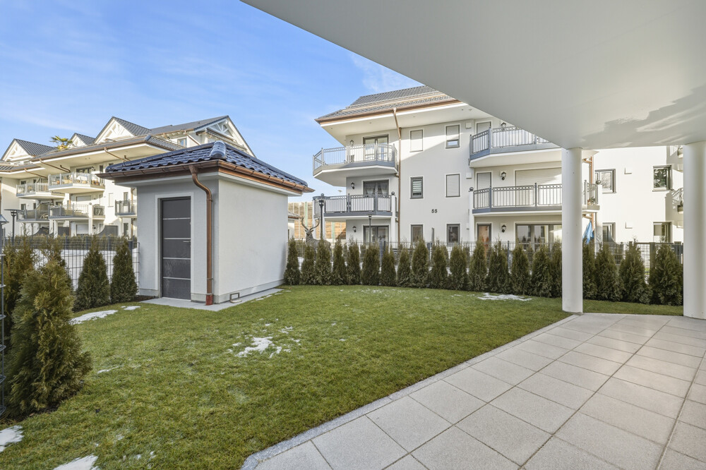 Zum Verkauf steht eine besondere Wohnung mit dem größten Garten der Anlage inklusive eigenem Gartenhaus. Hochwertige Ausstattung wie Fußbodenheizung, Videogegensprechanlage, Lift, Regendusche und Badewanne sowie edle Bodenbeläge sorgen für hohen Wohnkomfort.