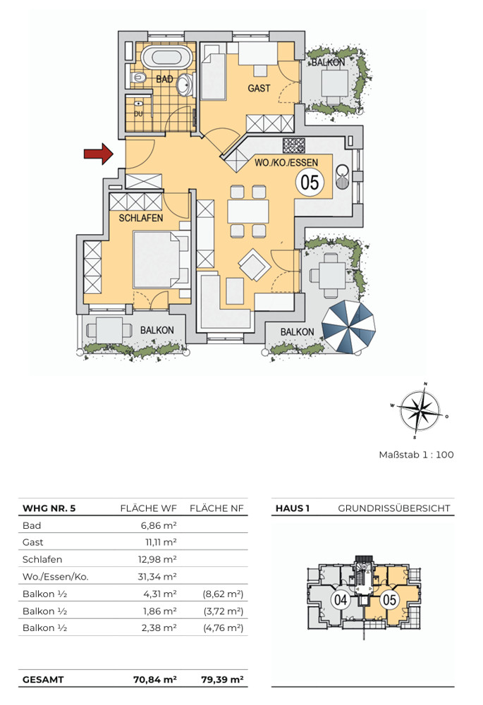 Alle Wohnungen verfügen über Balkone, Terrassen oder Dachterrassen. Innen sorgen Designböden, Fußbodenheizung und hochwertige Bäder für zeitgemäßen Wohnkomfort.