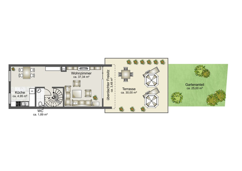 Gartenteil. Viele Fenster lassen viel Licht in die Wohnung. Über die innenliegende Wendeltreppe