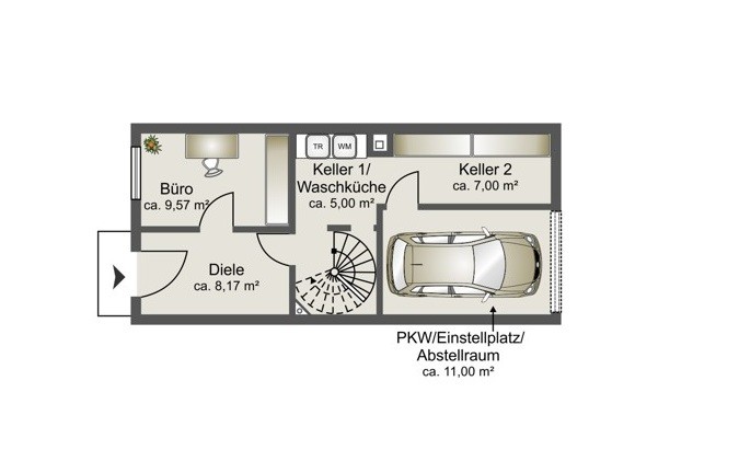Über den zweiten Kellerraum, welcher auch als Tiefgaragen-Stellplatz genutzt werden
