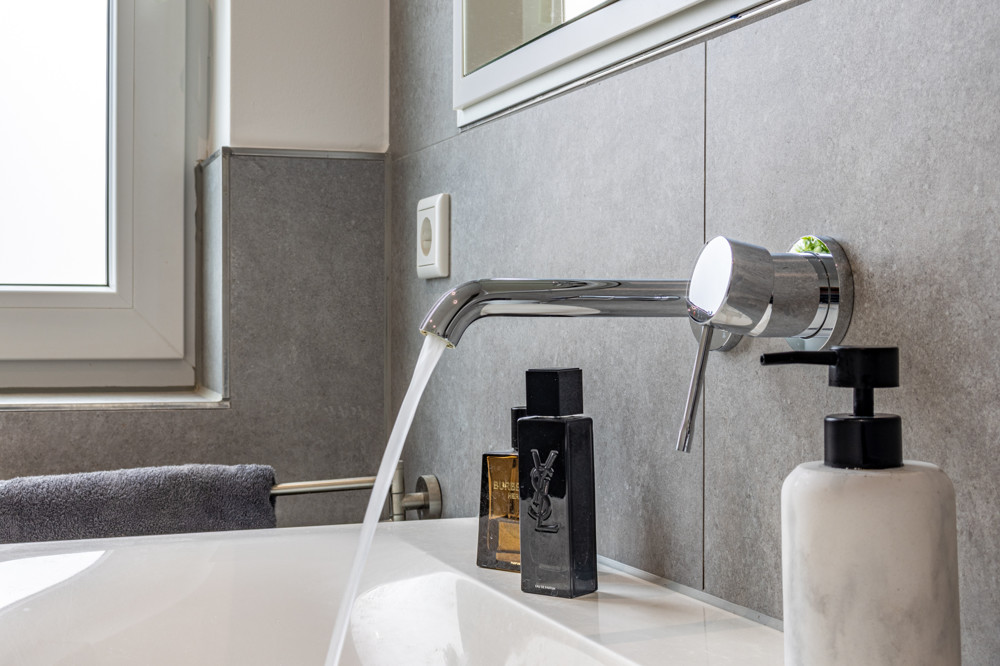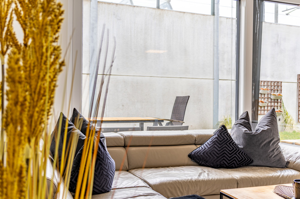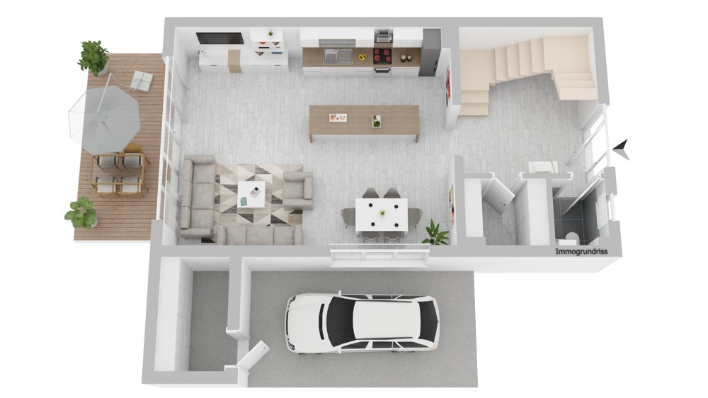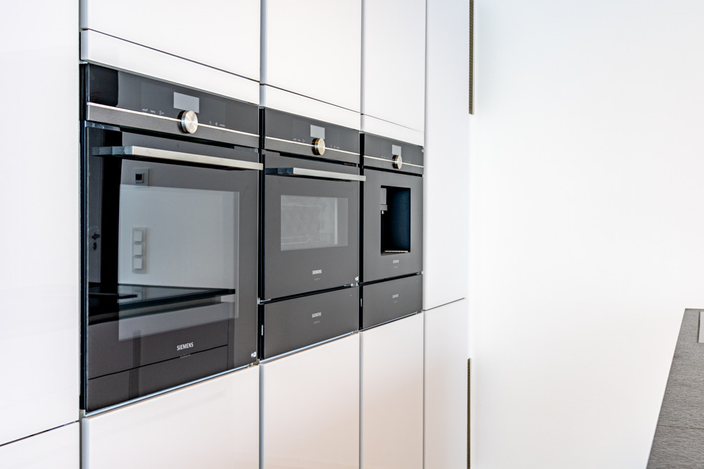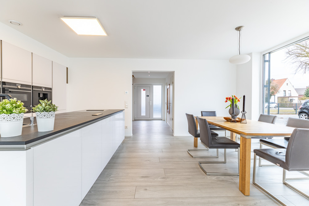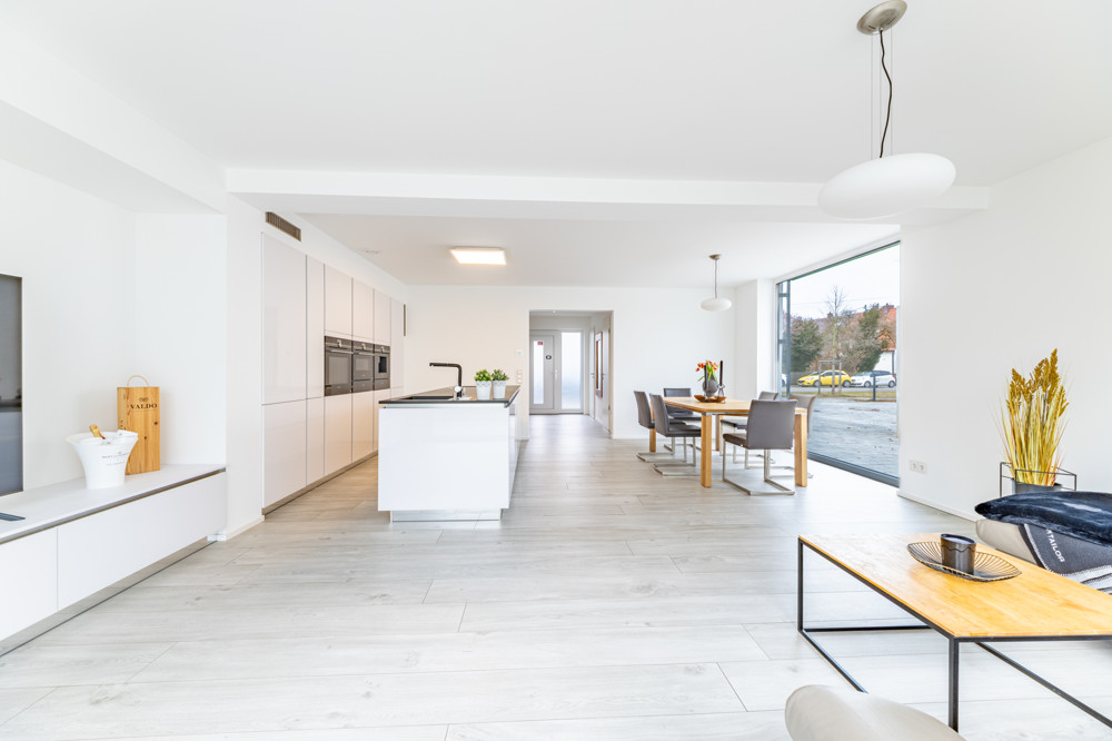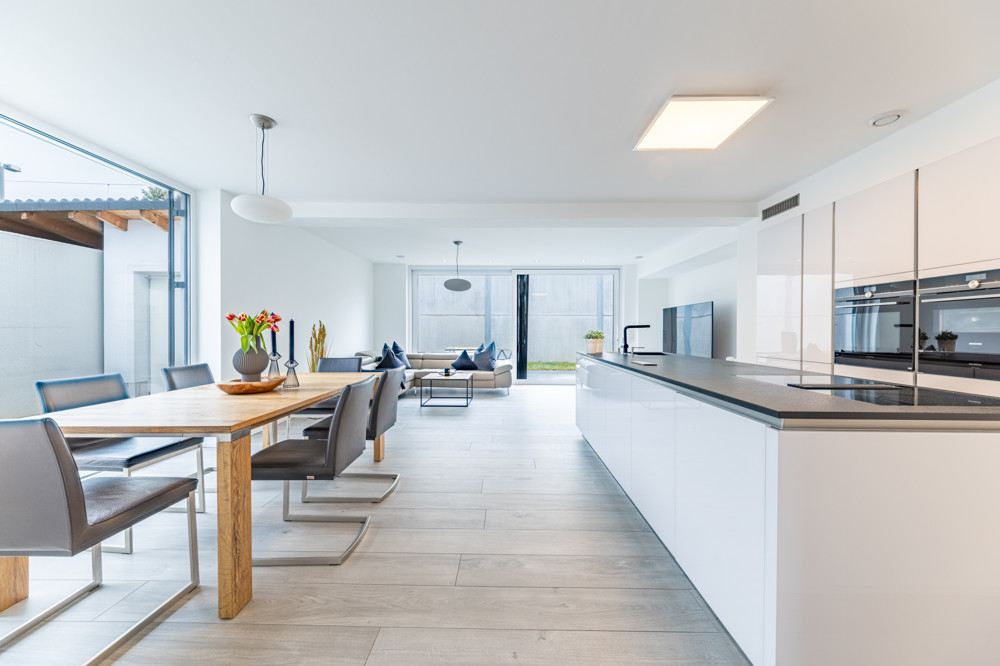 Die offene Küche ist modern gestaltet und mit hochwertigen Miele Elektrogeräten ausgestattet, was das Kochen und Essen mit Familie und Freunden zu einem besonderen Erlebnis macht. Von hier aus gelangt man direkt auf die Terrasse mit Garten, die ideal für gesellige Grillabende oder entspannte Stunden im Freien ist.
