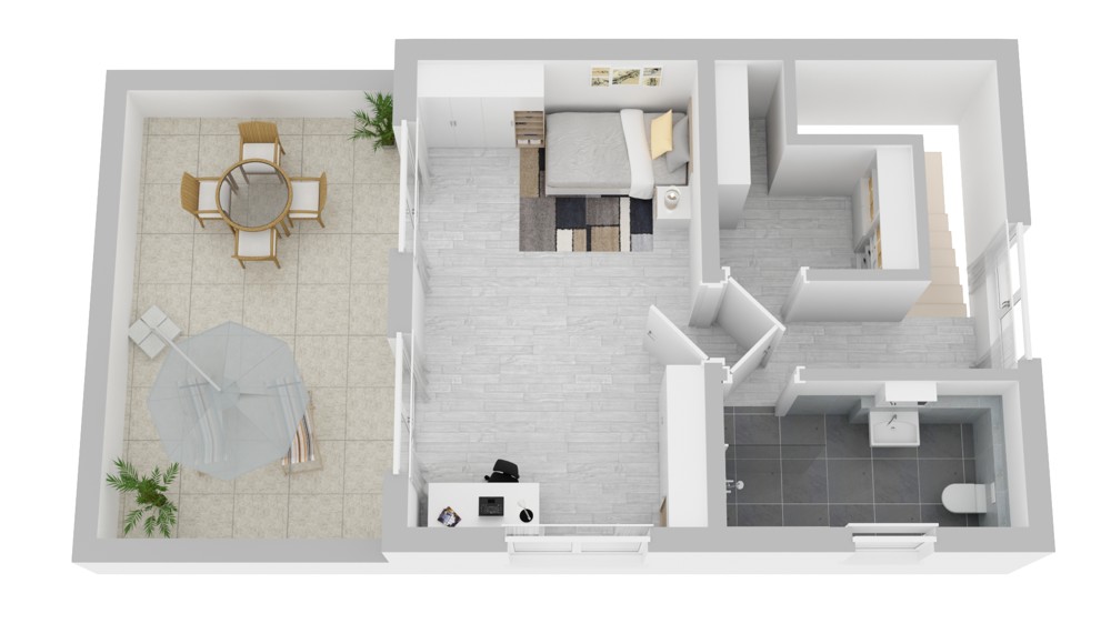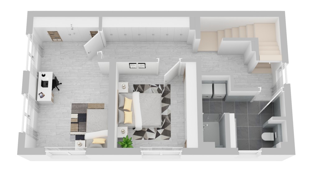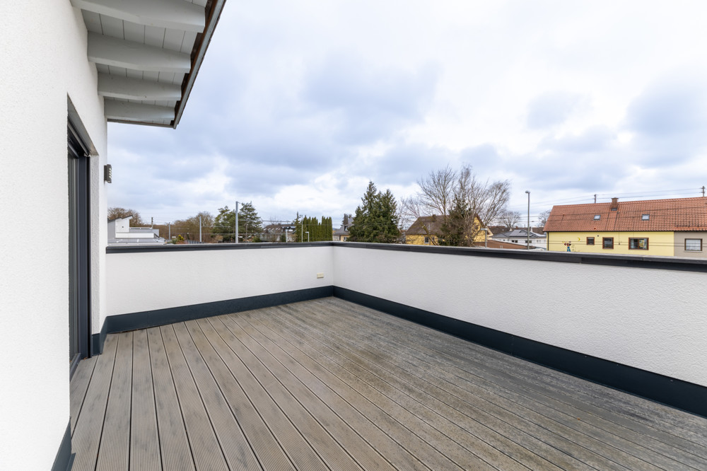 Eine Treppe führt ins Obergeschoss, wo sich zwei Schlafzimmer und ein modernes Duschbad befinden. Im Dachgeschoss erwartet Sie ein weiteres Zimmer sowie ein Badezimmer mit Badewanne, das sich hervorragend als Elternetage oder Büro nutzen lässt. Ein besonderes Highlight ist die großzügige Dachterrasse von über 22 m², die einen herrlichen Ausblick auf die Umgebung bietet.