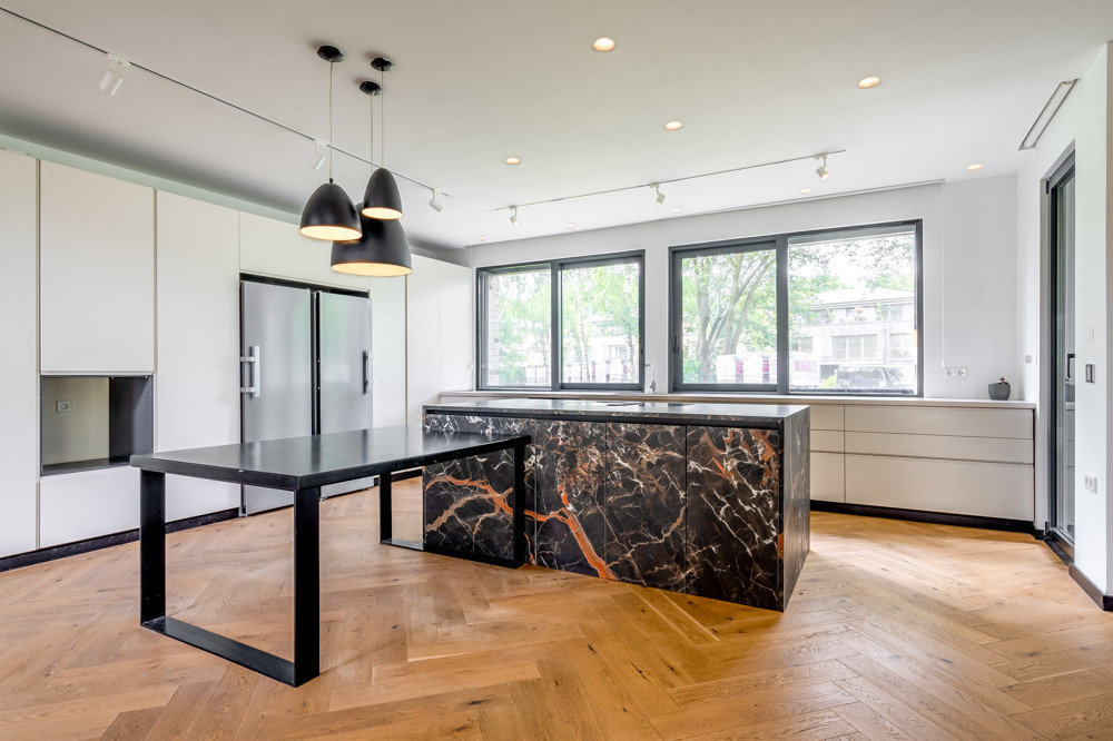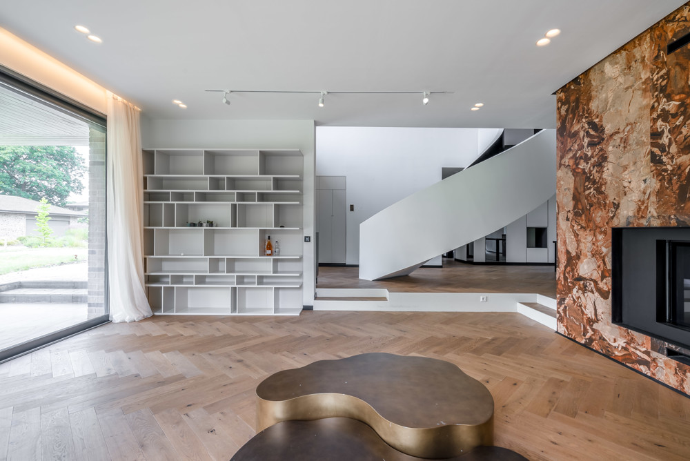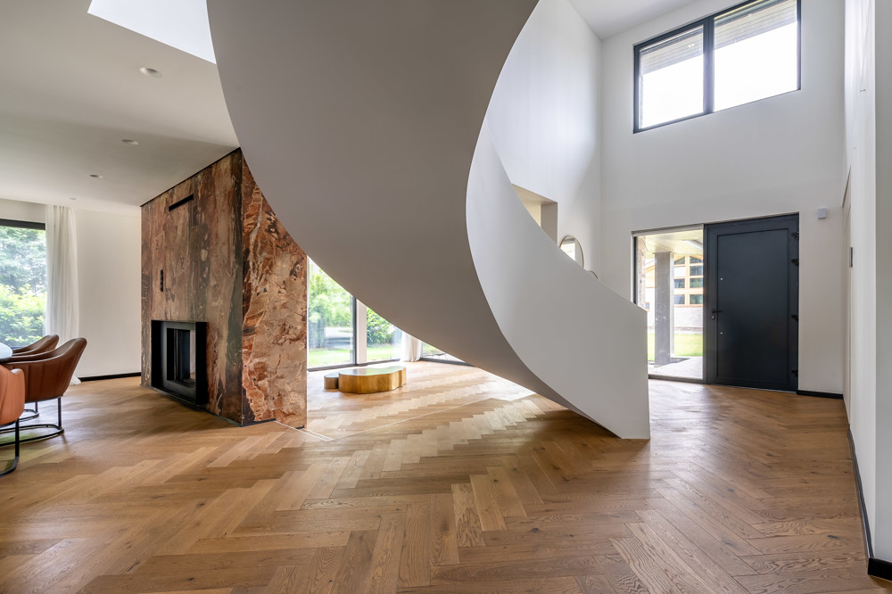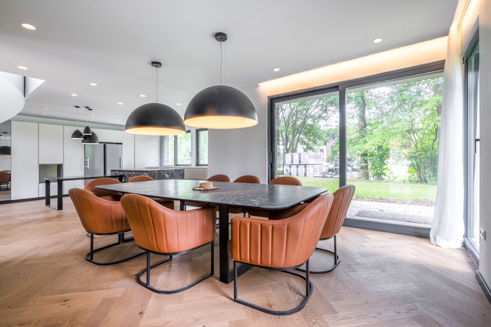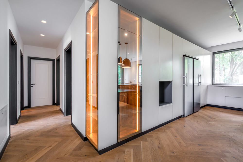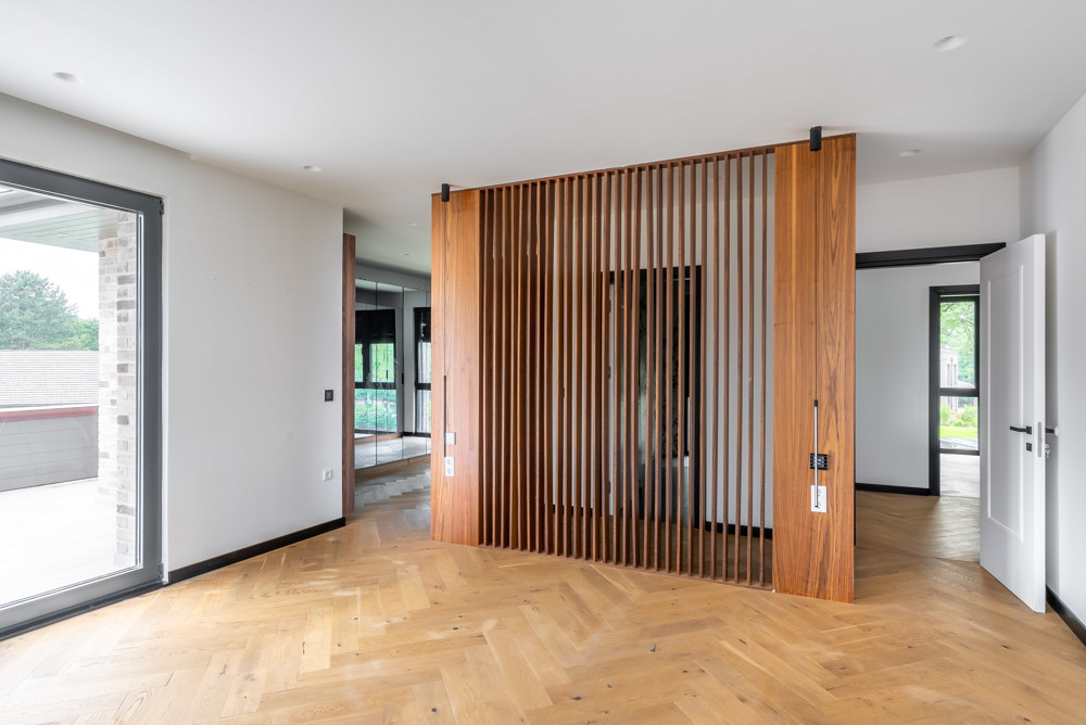 Erfüllen Sie sich großzügiges Wohnen in Neubauqualität. Eine einzigartige Immobilie mit viel Luxus. Flurbereich mit Blick in den offenen Wohnraum mit Wohnzimmer, Esszimmer und großer Küche mit Einbauküche. Alle Fenster sind großflächig, überwiegend bodentief mit Verschattungssystem. Im Blick auch die besonders konstruierte Wohnraumtreppe ins 1.OG.